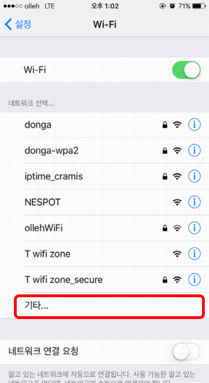 <기타네트워크  눌러 창을 빠져나옵니다.